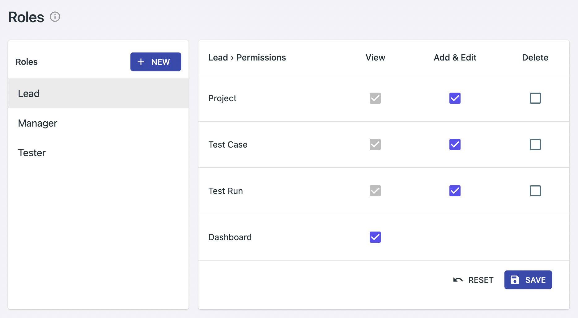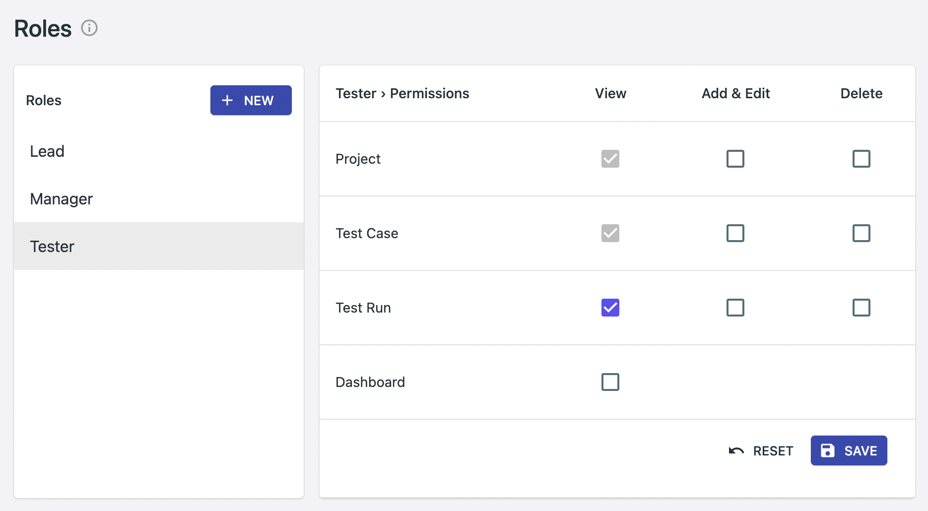 In the images below, the role Tester has view privileges on a project as well as its test cases and test runs. The Lead role has all the privileges of the Tester, the dashboard privilege, as well the edit privileges.