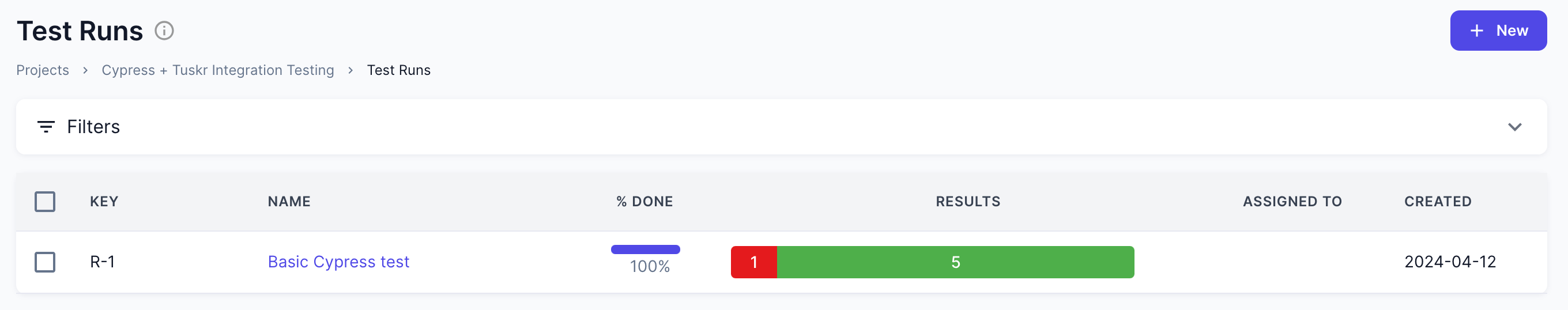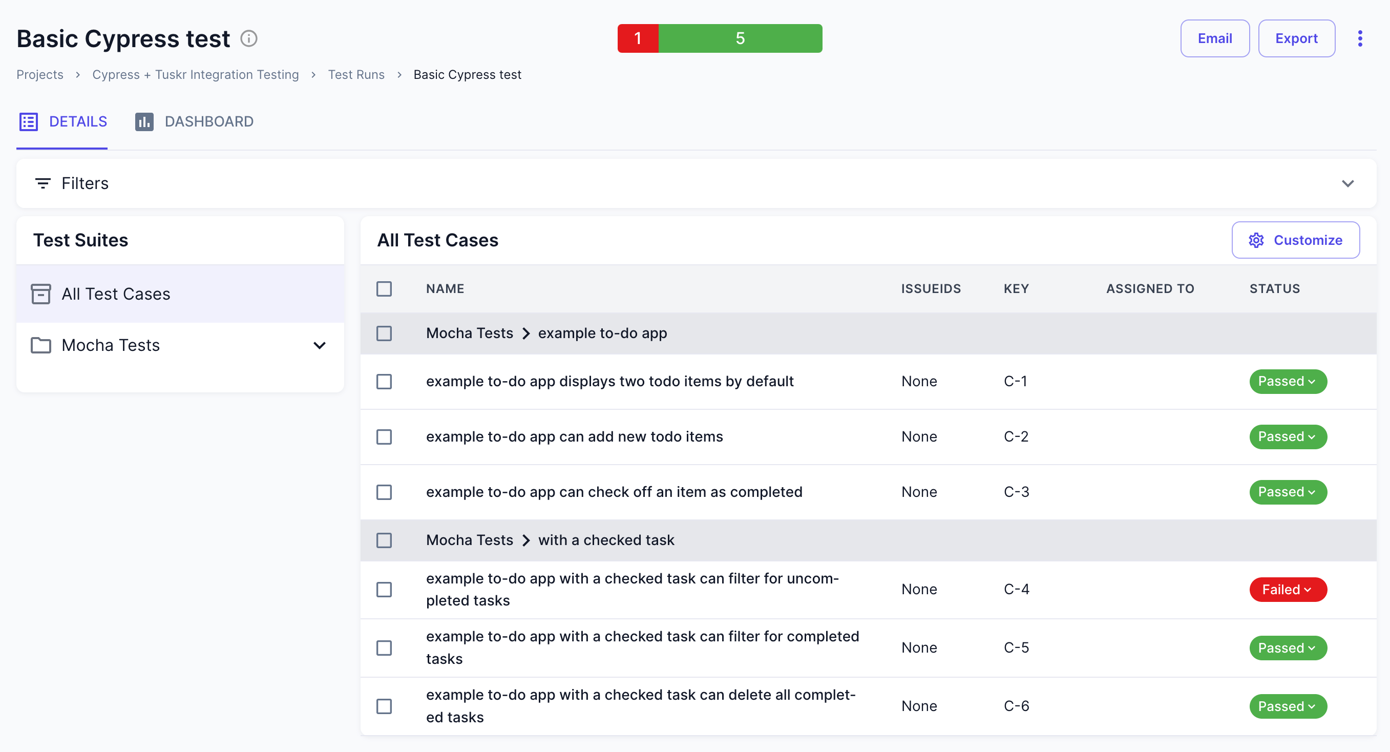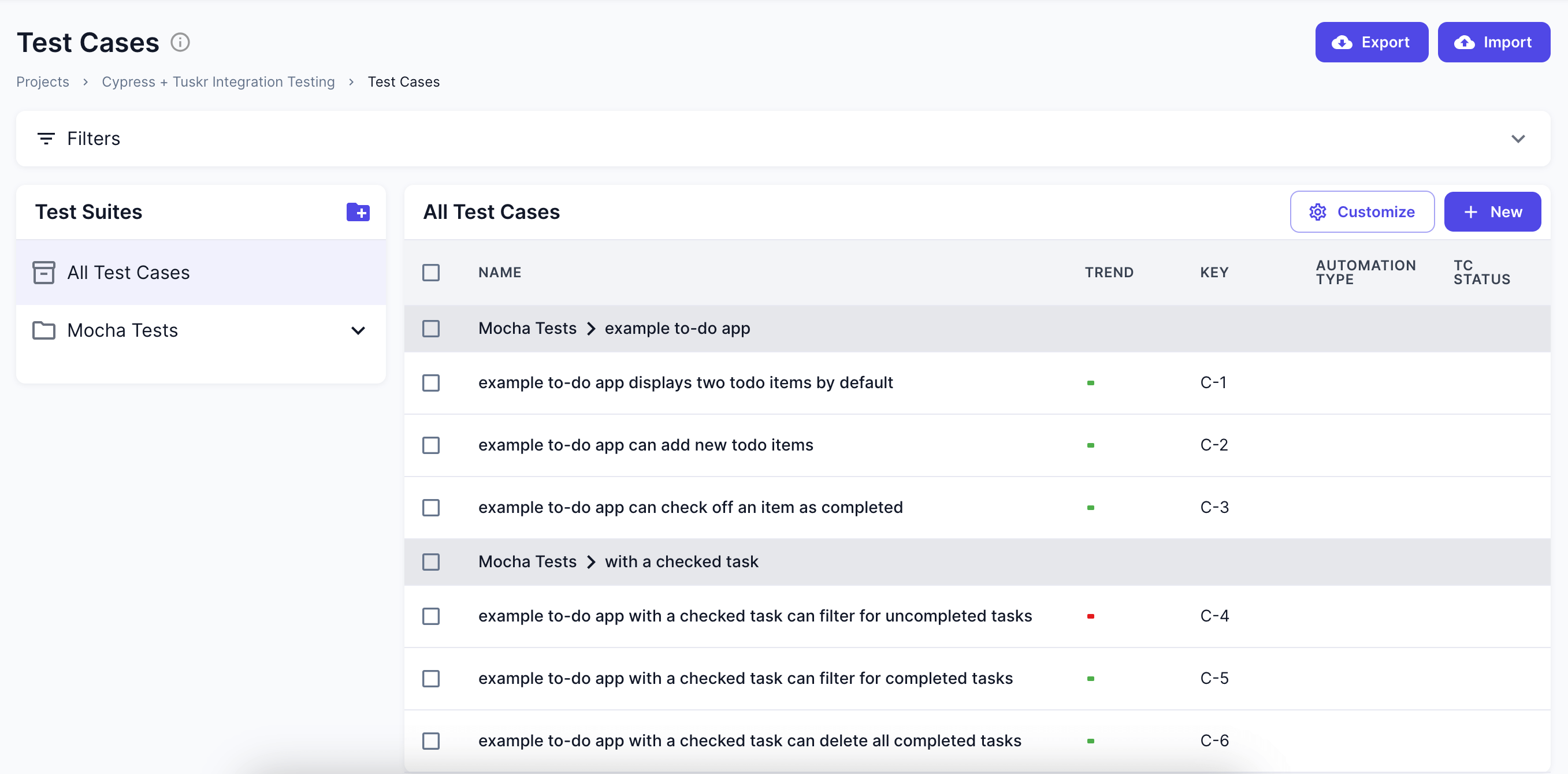 After successful import, a test run with the name "Basic Cypress test" along with test cases, sections and suites will be created automaically if not found in Tuskr.