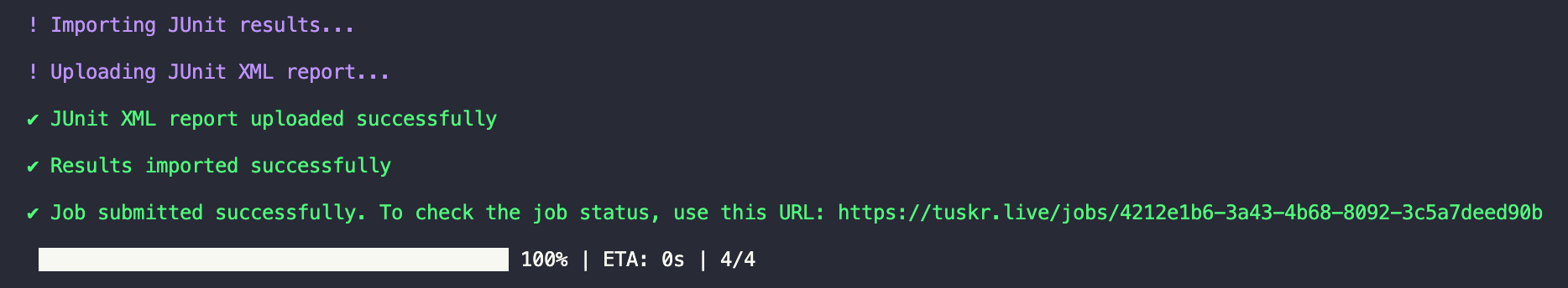 At the end of command execution, a URL will be displayed in the terminal which can be used to check the status of Junit XML import.