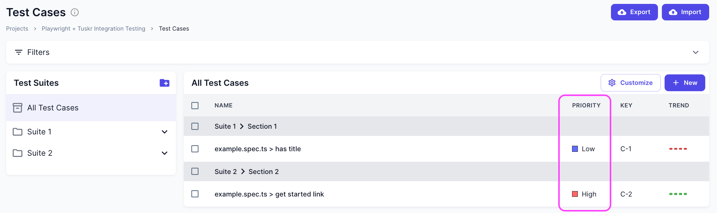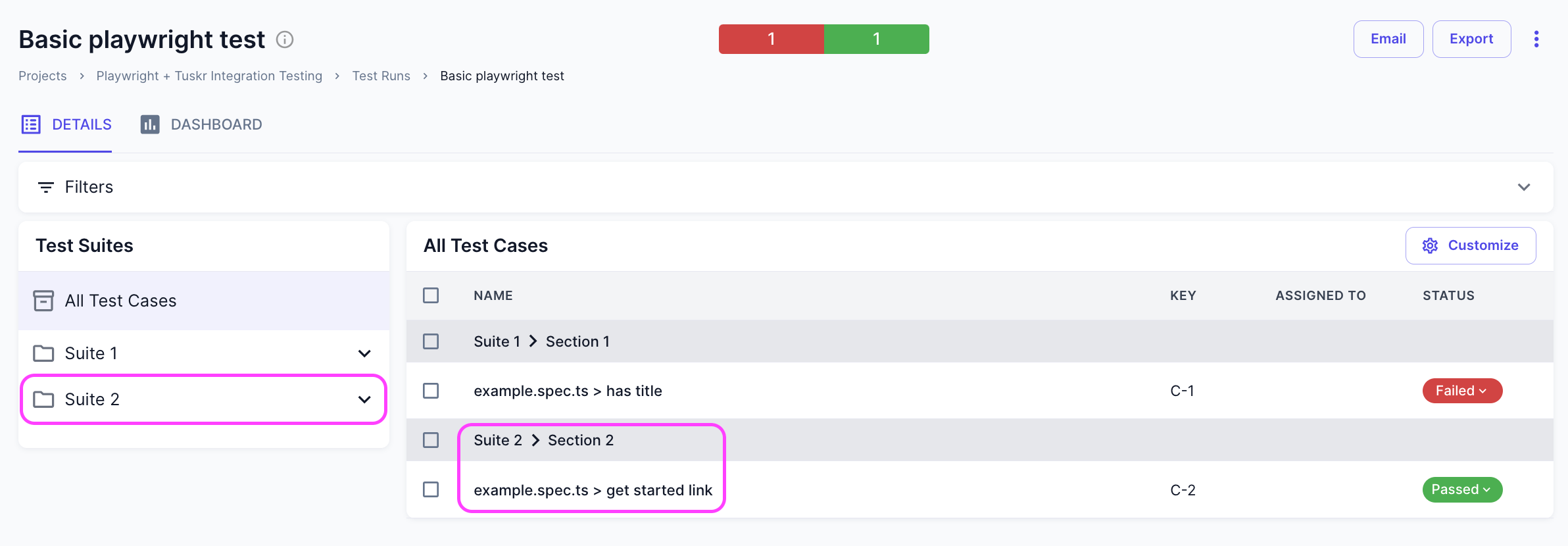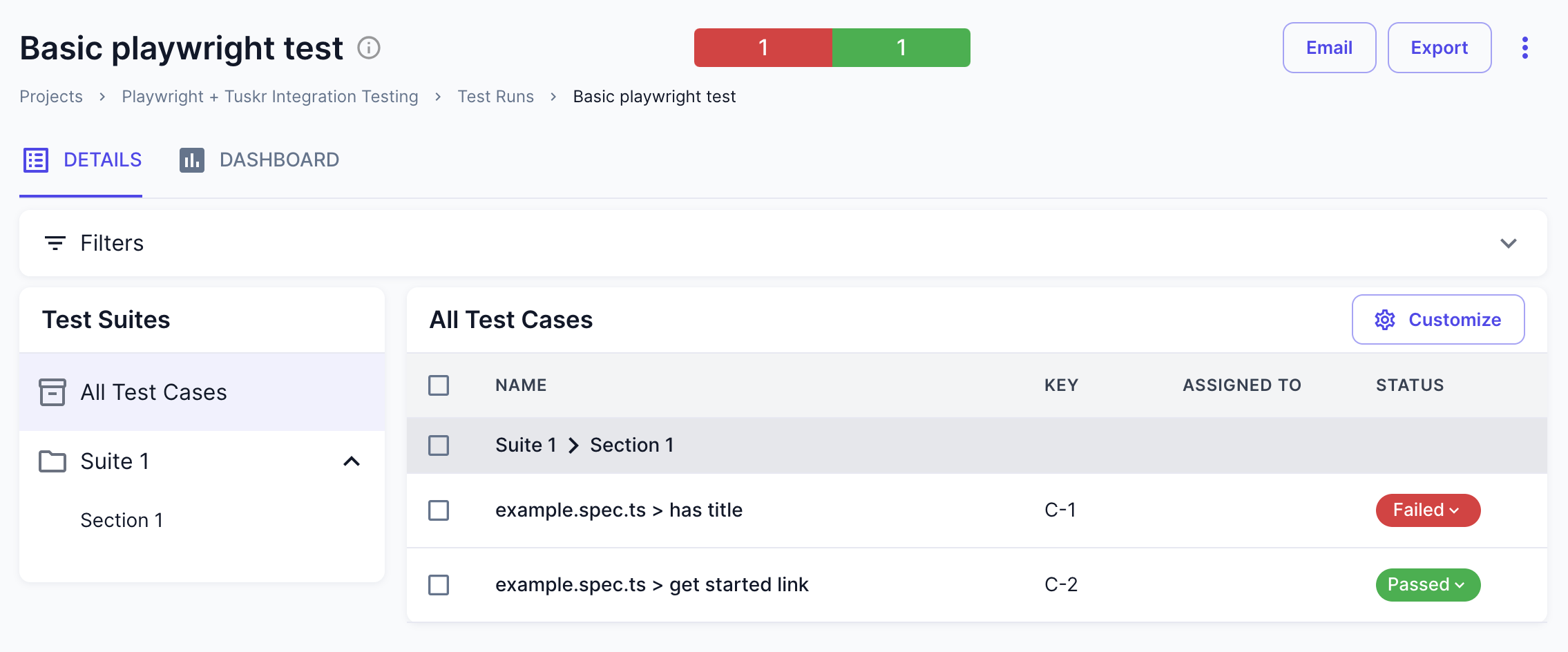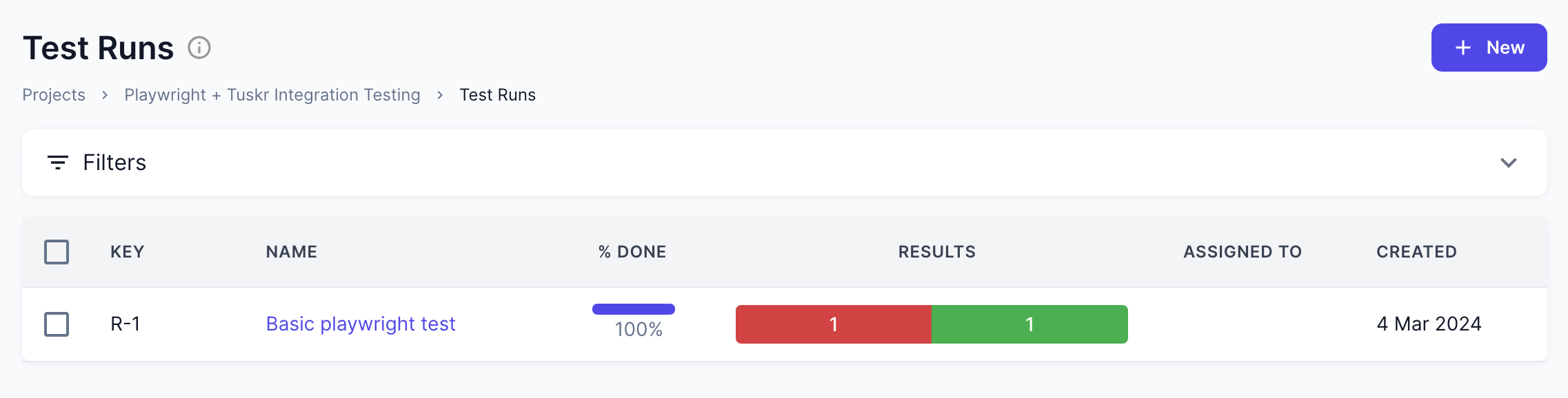 After successful import, a test run with the name "Basic playwright test" along with test cases, sections and suites will be created automaically if not found in Tuskr.