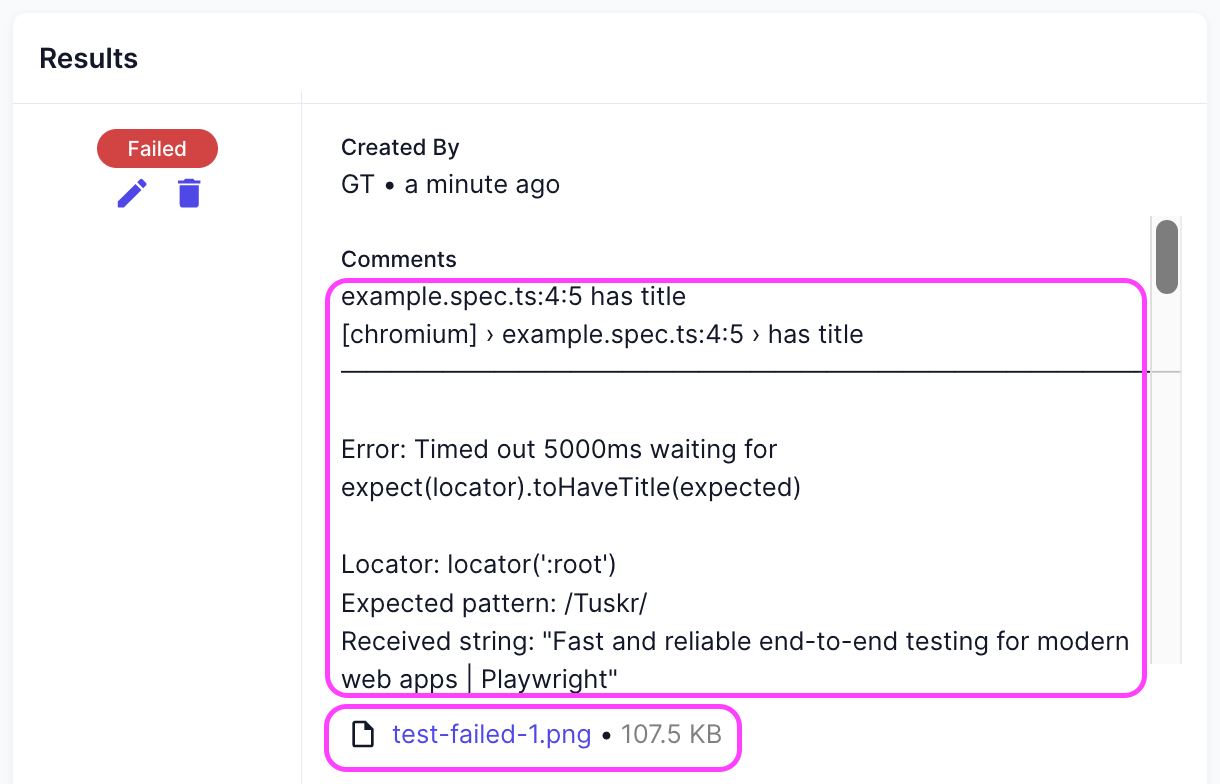 - Click on the failed test case and check the Results section, it will contain error details in the