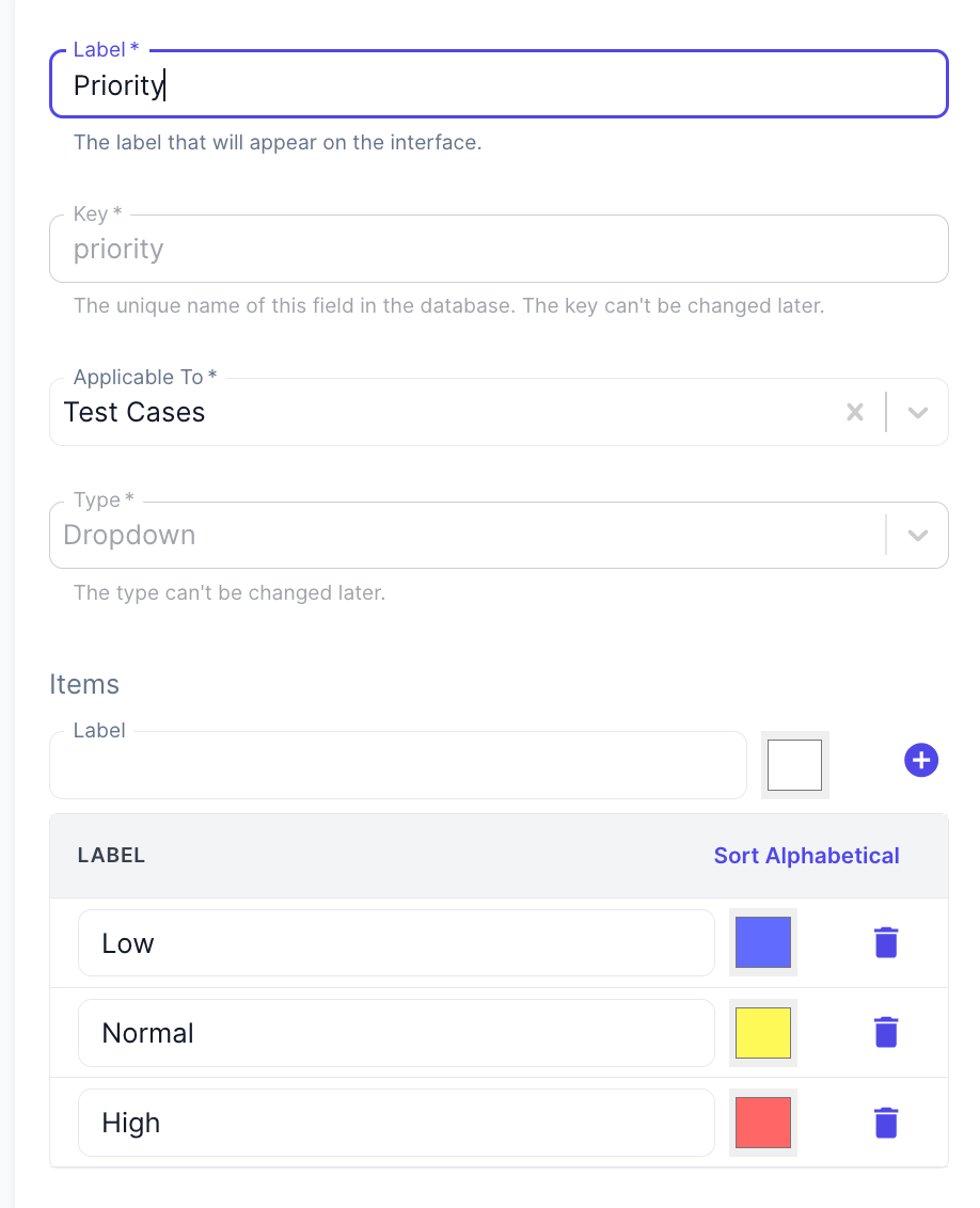 Let's create a new Dropdown custom field Priority with options as High, Normal and